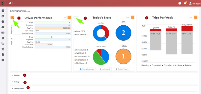 On the home screen when first logging into RoutingBox Web you will see the dashboard. The dashboard has a quick view of a few metrics including driver performance, today's/tomorrow's stats and trips per week.