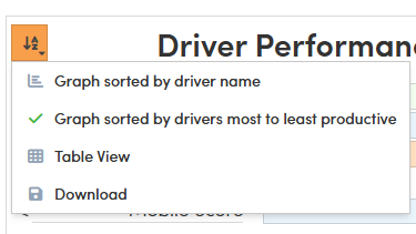 1. In the Driver Performance section, use the orange button with the arrow and “A–Z” icon to organize your data. With this control, you can display drivers from least to most productive (the default view), change to a table layout for easier comparison, sort by driver name, and download the Driver Performance data to support deeper analysis and reporting.