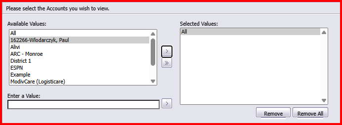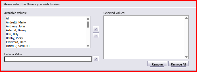 Select individual drivers, or select All drivers. Double click or use the arrows to move desired Accounts into the Selected Values window.