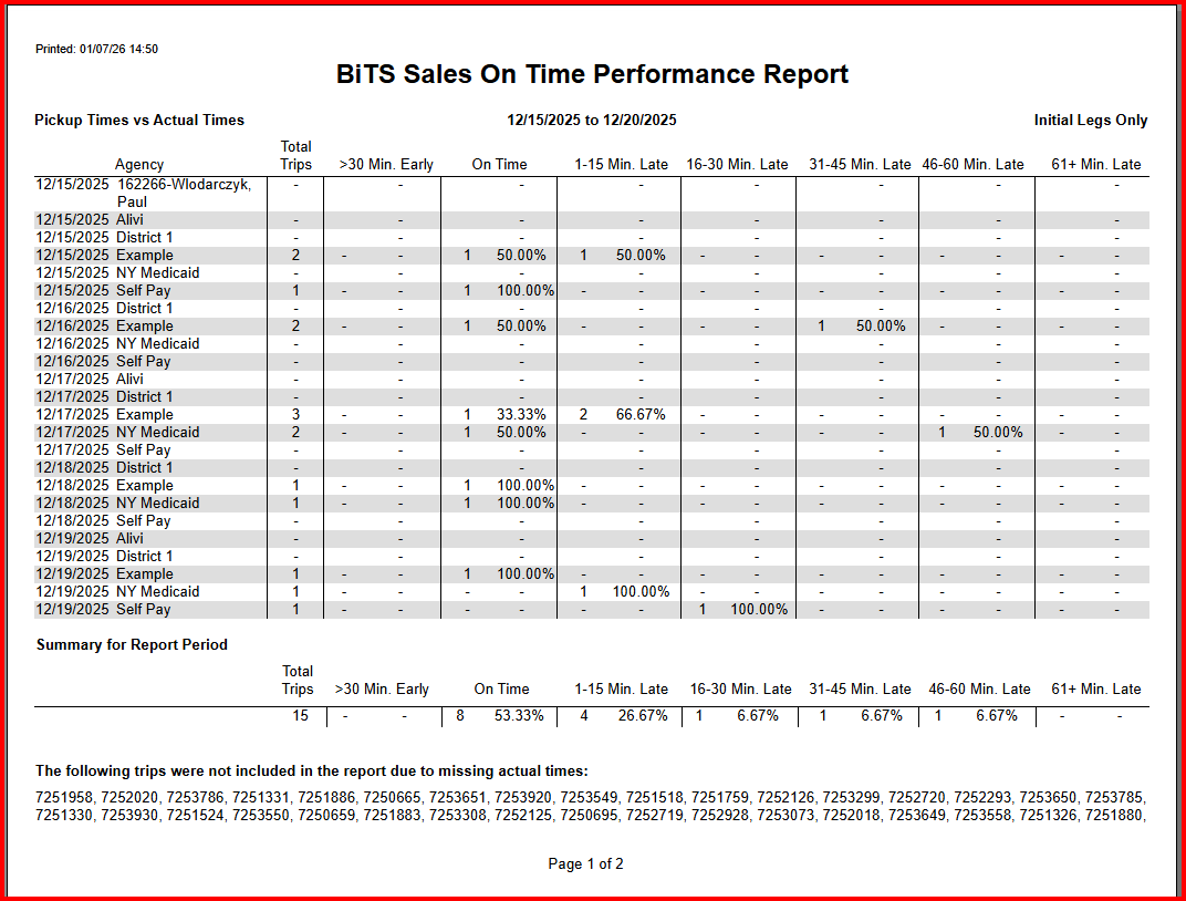 The On Time Performance report provides driver performance statistics regarding arriving at pickup or dropoff locations early, on time or late.
