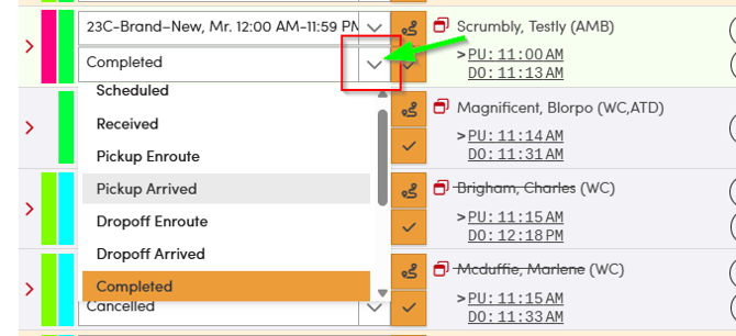 - Find the Status column for that trip. Click the status field to open the status selector.