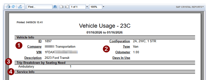 - Vehicle Information: Will display the configuration/type which is the capacity/capacity name assigned to the vehicle when the vehicle record was created, Odometer reading at the end of the time period and days the vehicle was used.